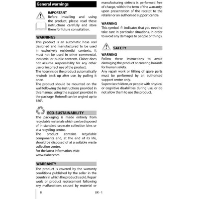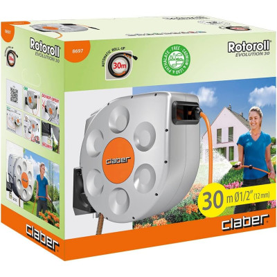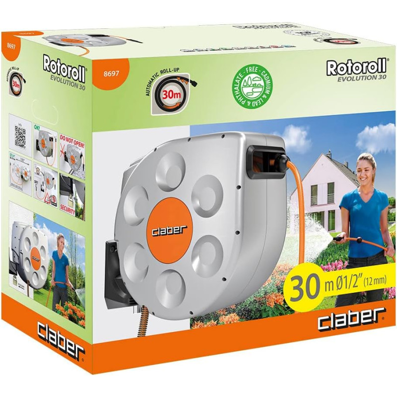 Avvolgitubo con riavvolgimento automatico, dotato di esclusivo meccanismo Slow Rewind per un utilizzo confortevole e sicuro. Pronto all’uso con 30 m di tubo speciale indeformabile con superficie anti-attrito per un avvolgimento rapido e perfetto. Costruito con materiali resistenti agli urti e ai raggi solari per garantire la massima durata nel tempo. Il supporto a muro in resina rinforzata, con perno in alluminio inossidabile, permette di orientare fino a 180° l’avvolgitubo nella direzione di utilizzo, evitando pieghe e strozzamenti del tubo. Dotato di prolunga per il collegamento al rubinetto (1,5 m), presa 3/4” (20 - 27 mm) per il collegamento al rubinetto, raccordi automatici e lancia a spruzzo. Completo di supporto a muro, viti e tasselli per il montaggio a parete.