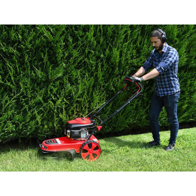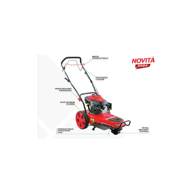 Dotato di un'ampiezza di taglio di 56 cm, monta una testina in acciaio a 4 fili da 4 mm, montata a sua volta su albero in acciaio sottolineando così la solidità della macchina.