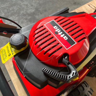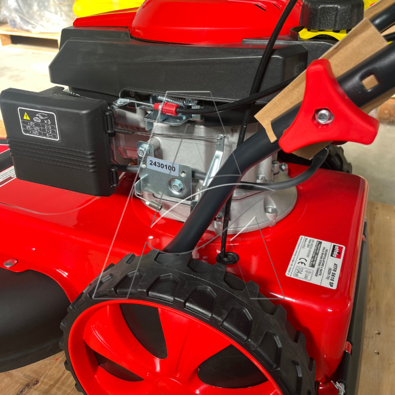 Questo decespugliatore a ruote si distingue in quanto dotato di rinvio tra motore e lama con trasmissione a cinghia. Freno di sicurezza arresto motore e leva taglio si trovano posizionati sul manico.
