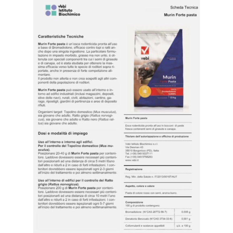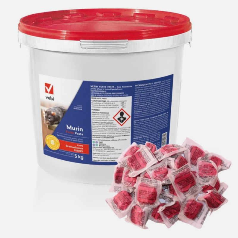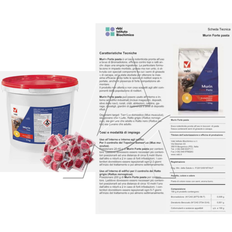 MURIN FORTE PASTA è un’esca rodenticida pronta all’uso a base di Bromadiolone, efficace contro topi e ratti anche dopo una singola ingestione.
