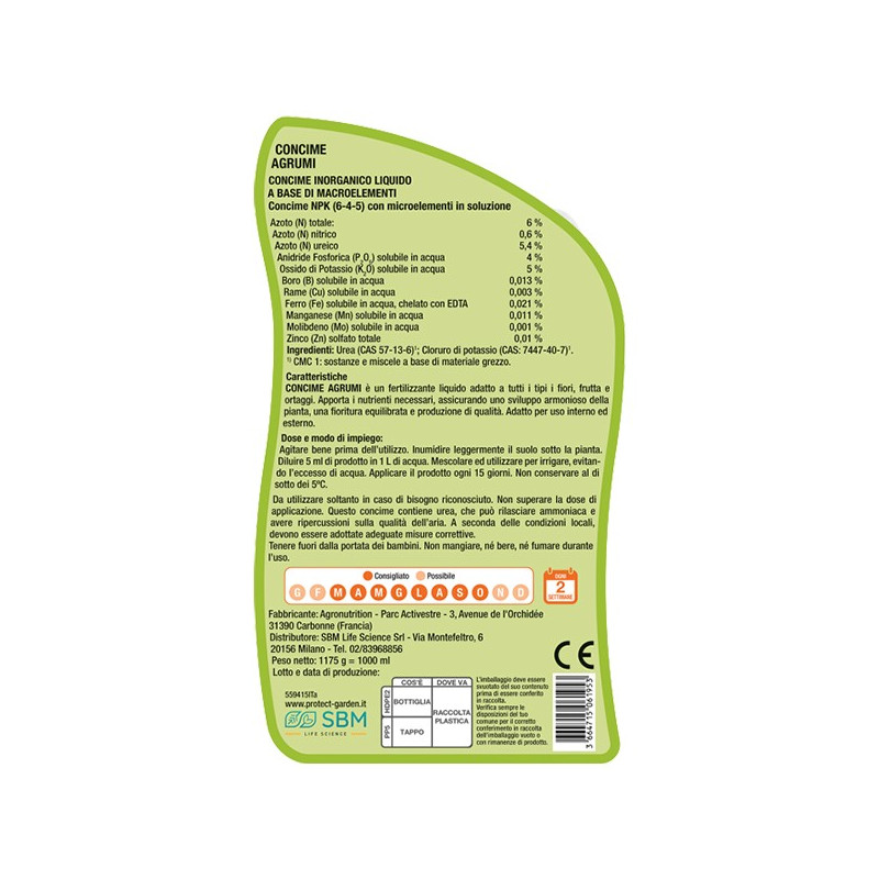 Concime Liquido Agrumi è il prodotto ideale per gli agrumi in vaso, garantendo uno sviluppo vegetativo con un ottima colorazione del fogliame. E' inoltre indicato per la concimazione di tutte le piante mediterranee.
