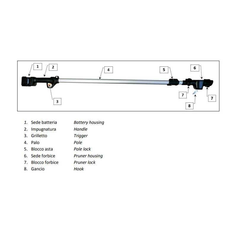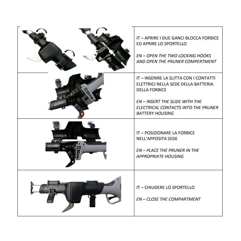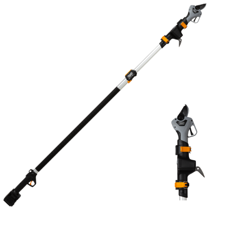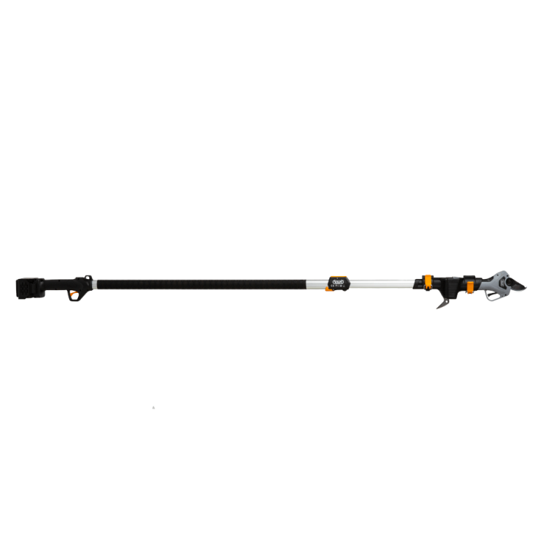 La struttura telescopica regolabile in 5 posizioni, unita all’alloggiamento dedicato per batteria e forbice, garantisce massima stabilità e praticità nelle operazioni di potatura.