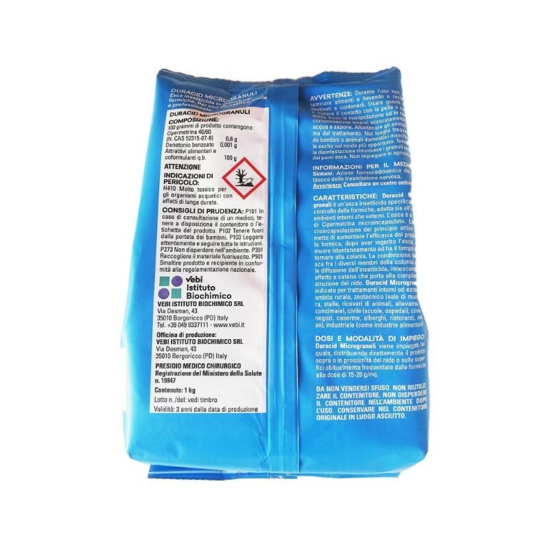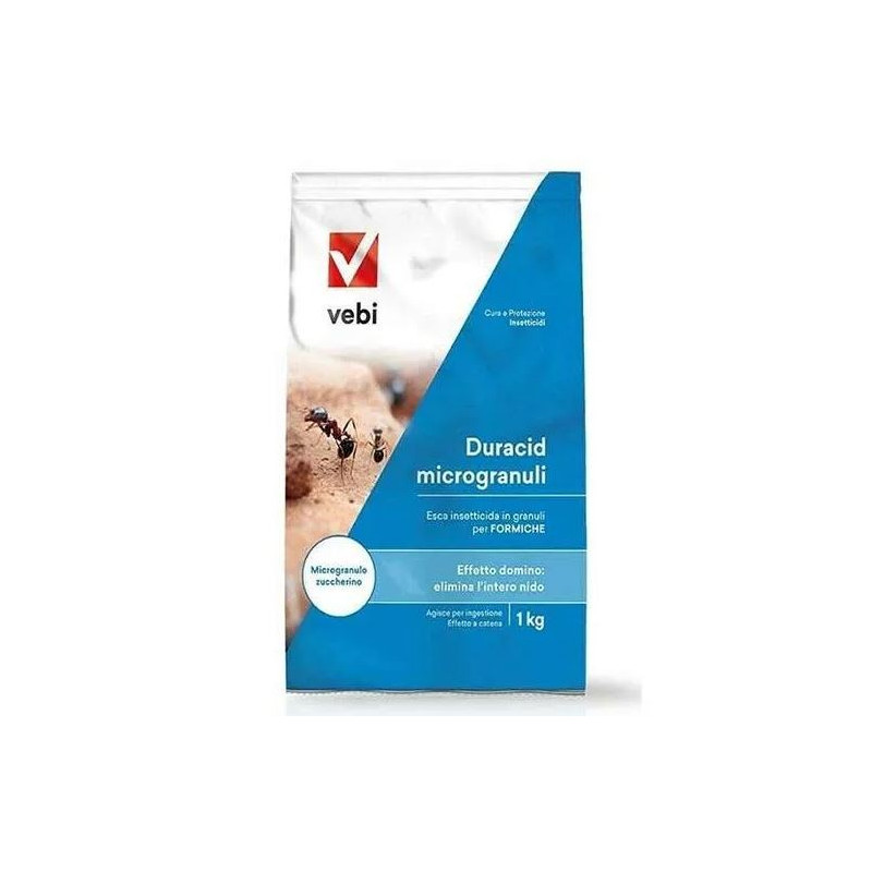 DURACID MICROGRANULI è un insetticida con formulazione specifica contro le formiche. La microincapsulazione del principio attivo permette di aumentare l’efficacia del prodotto: la formica, dopo aver ingerito l’esca, non muore istantaneamente e ha il tempo di tornare alla colonia, condividere l’esca e innescare l’effetto domino che porterà alla completa distruzione del nido.