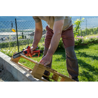Motosega a batteria leggera e comoda da usare, per la cura occasionale del verde e semplici lavori artigianali.