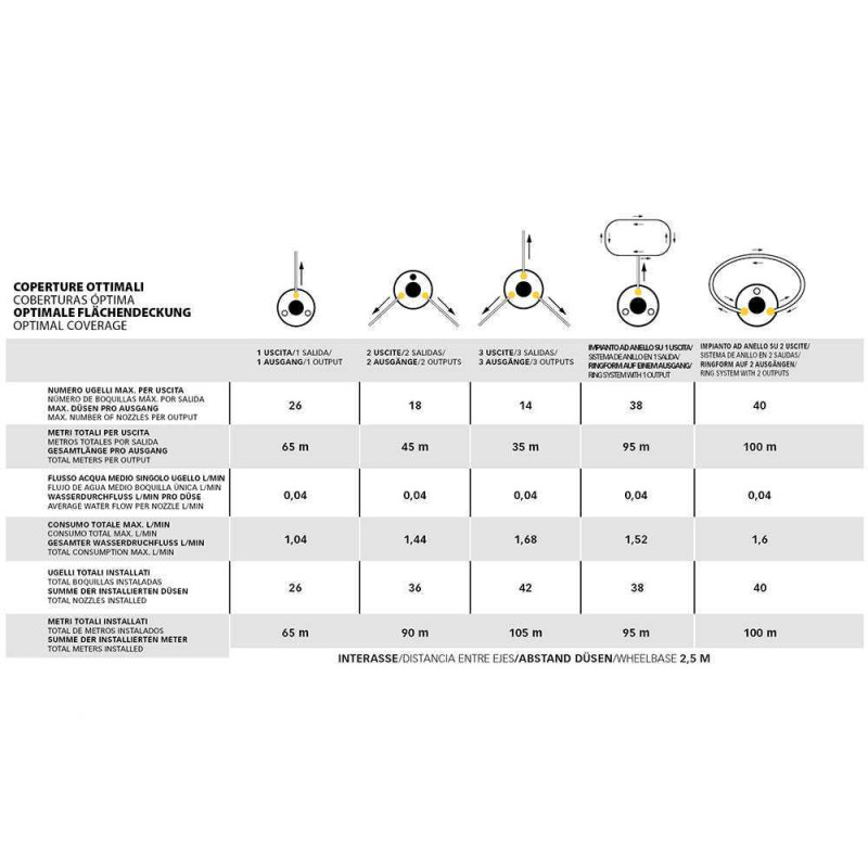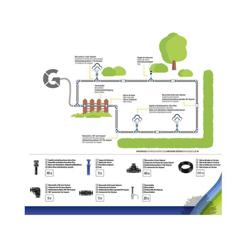 Il kit è facile da assemblare, tagliando il tubo e inserendo i raccordi e/o gli ugelli nei punti prescelti: per combinarlo al nebulizzatore è sufficiente attaccarlo a uno degli attacchi per gli ugelli già presenti sul nebulizzatore, dopo aver rimosso l'ugello.
