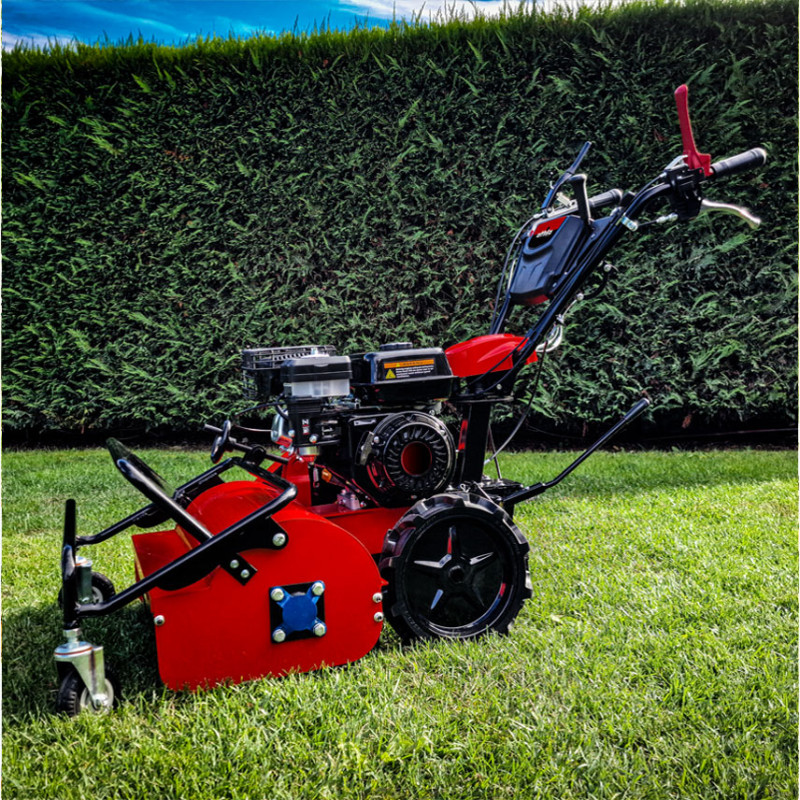 La trasmissione in alluminio con cambio a ingranaggi offre 2 marce avanti e una retromarcia istantanea, gestibile direttamente dal manico. Le ruote anteriori pivotanti migliorano la manovrabilità, mentre le ruote posteriori con profilo agrario garantiscono stabilità e trazione su ogni terreno.