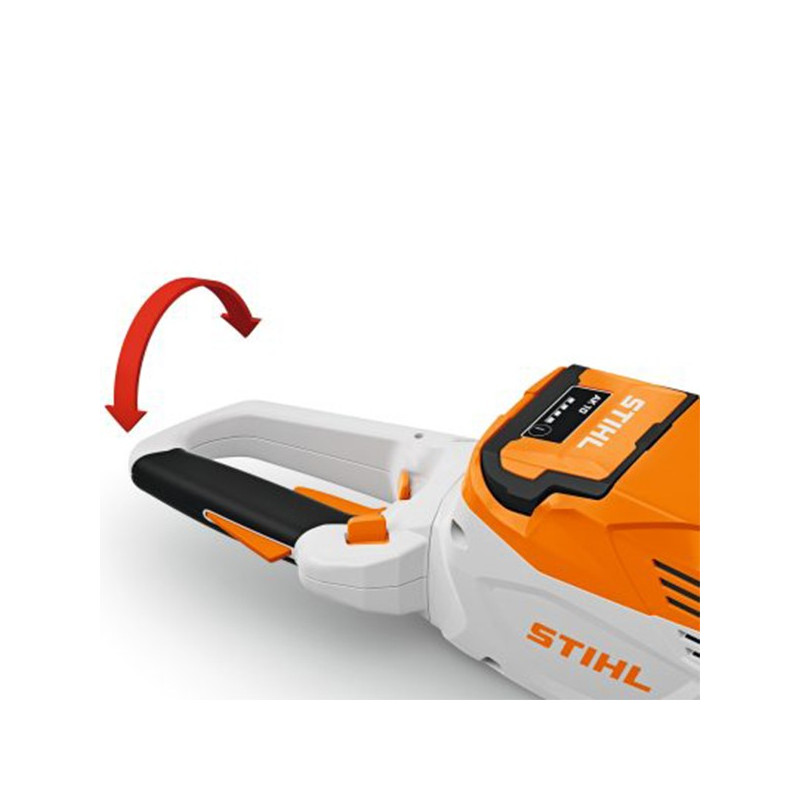 Lavoro ergonomico e confortevole. L'impugnatura multifunzione girevole consente di lavorare con il tosasiepi in modo preciso e confortevole durante il taglio laterale o sopra la testa. Inoltre può essere ruotata di 90° a sinistra e a destra, rendendo l'attrezzo adatto sia ai mancini che ai destrorsi. In questo modo il dispositivo si trova sempre nella posizione ergonomicamente più confortevole per la mano.