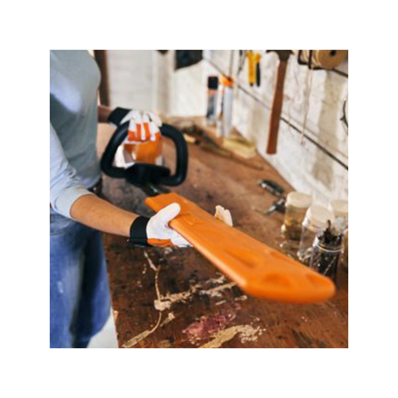 Trasporto e rimessaggio in tutta sicurezza. Grazie all'apposita protezione per la lama, è possibile trasportare e riporre il tagliasiepi o il rifinitore in tutta sicurezza
