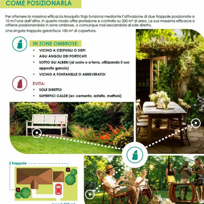 Va posizionata nelle aree ombrose dei giardini o dei porticati, 2 trappole installate strategicamente a 10 metri una dall’altra coprono un’area di circa 200 metri quadri.