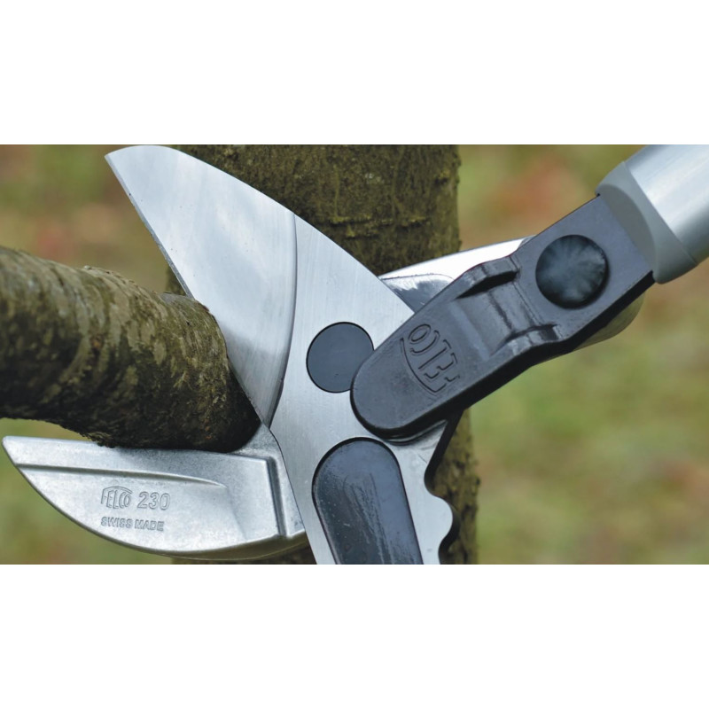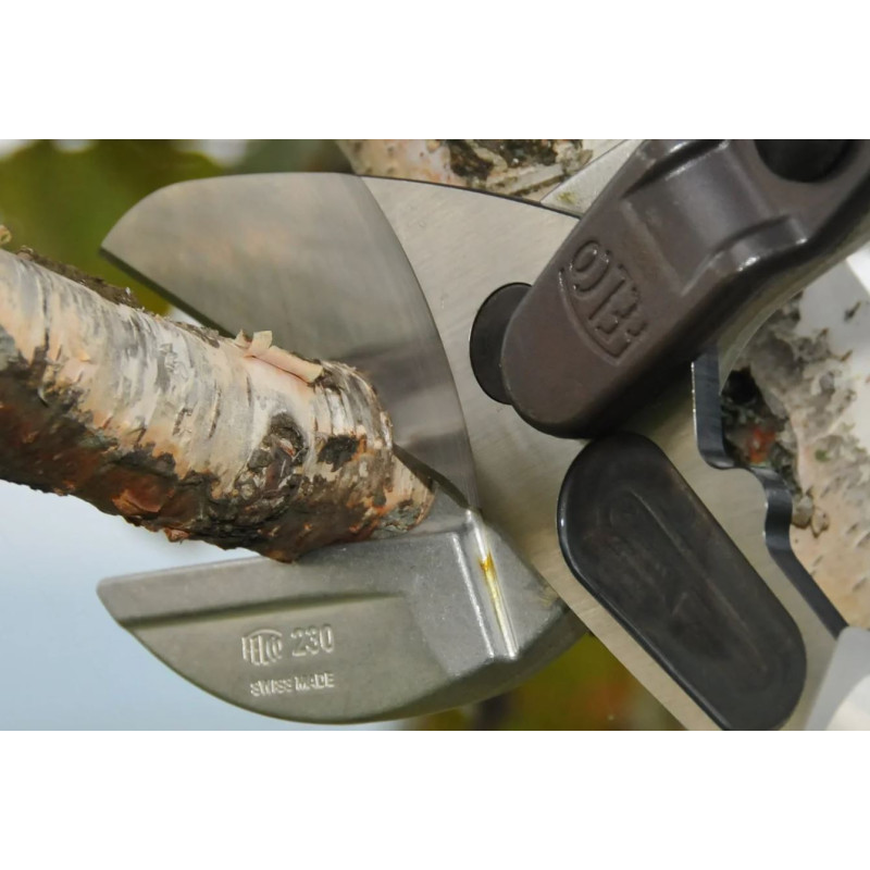 Un modello di nuova generazione con il famoso taglio a tiro, studiato per il professionista. Nuova tecnologia con bullone autolubrificante, lama in acciaio di altissima qualità, manici lunghi super-leggeri in alluminio. Taglia rami con Ø 45 mm. Tutti i pezzi sono facilmente sostituibili.